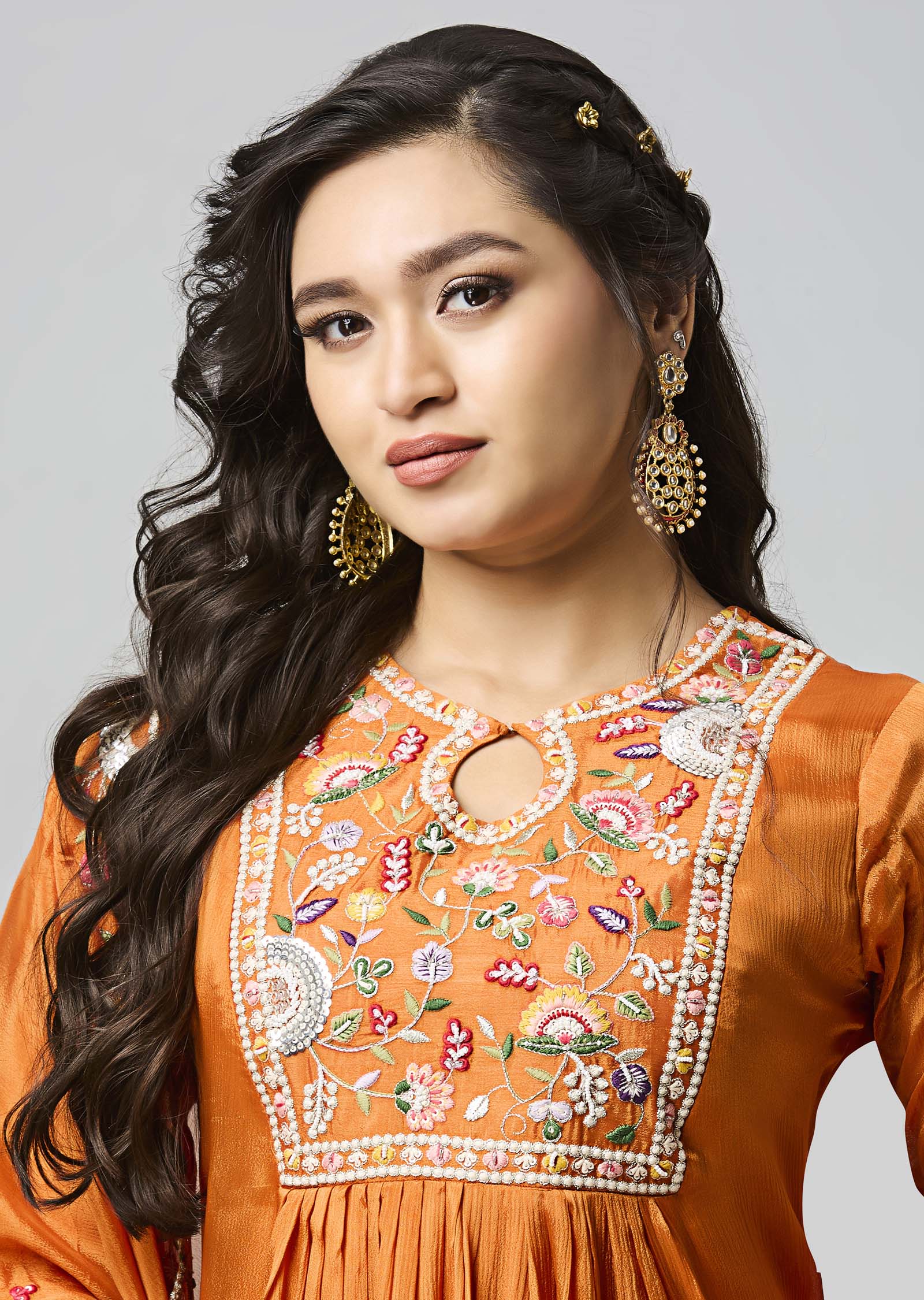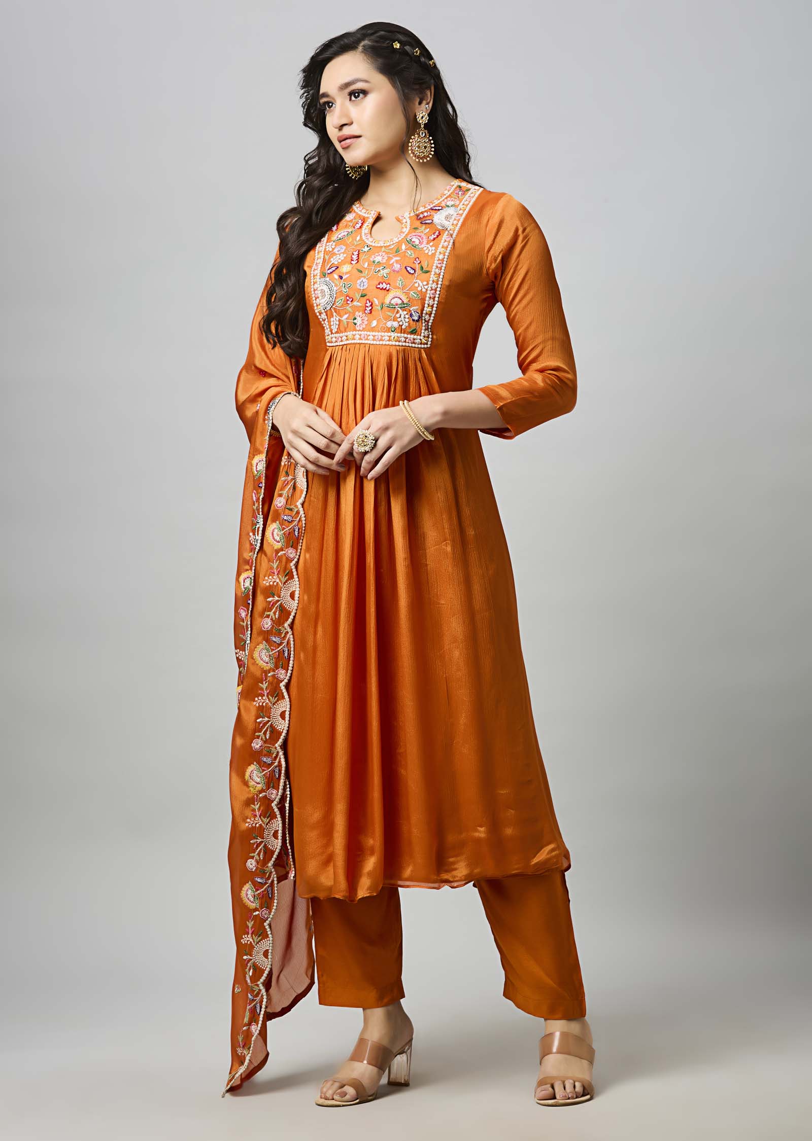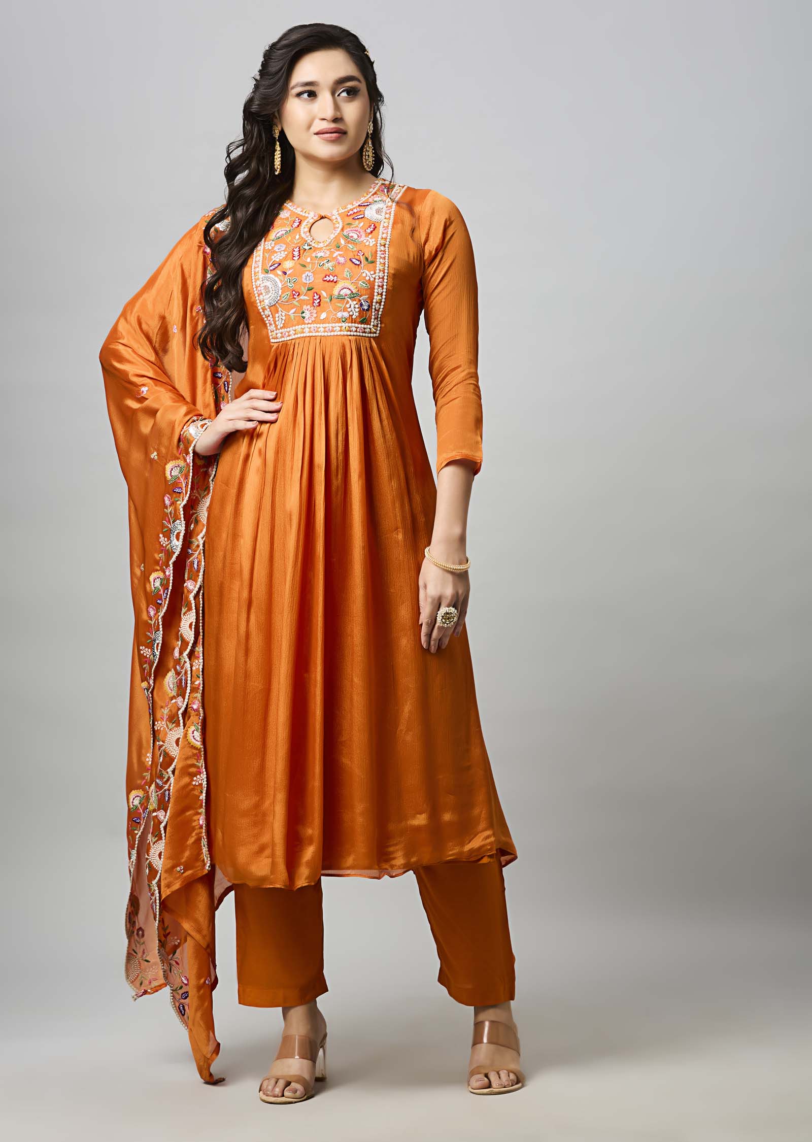 Orange Chinnon A-Line Kurti With Dori, Pearls, Sewuence & Resham Work, Matching Pant & Dupatta